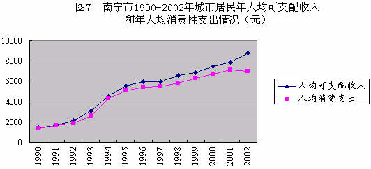 隨著經(jīng)濟(jì)的騰飛和南寧市在全區(qū)率先實(shí)現(xiàn)跨越式發(fā)展以及全面建設(shè)小康社會(huì)的要求,人民生活水平得到進(jìn)一步改善。2002年南寧市人均GDP如果不包括5個(gè)縣,已達(dá)12024元,包括5個(gè)縣,達(dá)7145元;恩格爾系數(shù)低于全國平均水平,2002年為37.46%,這標(biāo)志著南寧市人民生活水平已有很大提高,居民購買力增強(qiáng),成為拉動(dòng)消費(fèi)品市場(chǎng)發(fā)展的主要力量(見圖7)。