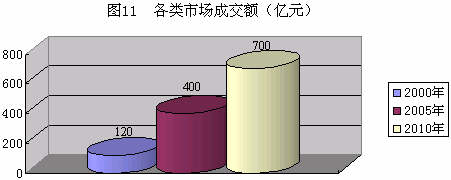 各類市場(chǎng)成交額2005年達(dá)到400億元,比2000年增長2.3倍,年均增長27.2%;2010年達(dá)到700億元,比2000年增長4.8倍,年均增長19.3%。