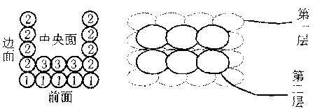 陳列方法(見圖6—2):首先要決定底面最下層的前面部分,接下來排邊面,然后才排中央面第一層的部分。第二層要排在第一層商品與商品的中心點(diǎn)。接下來再排第三層、第四層。