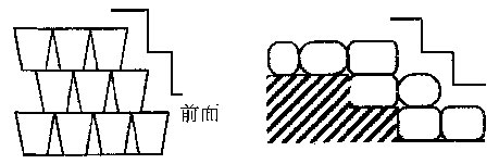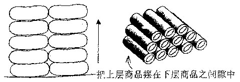 陳列方法(見圖6—6):先決定好第一層商品的排列方向,然后陳列底面的部分,接著排前面和邊面的部分。排第二層的商品時(shí),要與第一層的商品保持直角,形成格子狀。紅蘿卜或蘿卜,要將根或葉子的部分保持一定的方向,交互堆積成格子狀或“井”字狀。