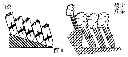 將蔥等長形的果菜朝一定的方向排列時(shí),邊面的地方就會(huì)形成一條直線。這種陳列稱為“莖排型”。