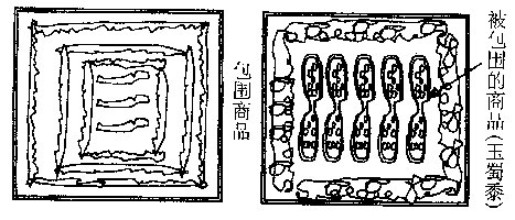 這是一種將某種商品用別的商品來圍繞,或利用隔物板、容器等圍起來的一種陳列方式。陳列方法(見圖6—14):一邊排列前面和邊面的部分,一邊決定底面的商品(包圍商品)。將被包圍的商品并排堆高。最重要的是選擇商品時(shí),要考慮到色彩的效果。