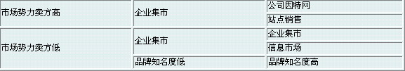為了確定什么樣的市場(chǎng)戰(zhàn)略對(duì)賣方最有效,我們需要考慮賣方的市場(chǎng)勢(shì)力及其產(chǎn)品的牌知名度兩個(gè)因素。如果一個(gè)商是這個(gè)行業(yè)的主導(dǎo)廠商并且其產(chǎn)品具有明顯的品牌知名度,那么它應(yīng)該考慮建立自己的因特網(wǎng)站點(diǎn)銷售產(chǎn)品。例如,思科公司是路由器市場(chǎng)的主導(dǎo)廠商,利用它的品牌知名度的其因特網(wǎng)站點(diǎn)上獲得大量的客戶。而那些缺乏足夠的市場(chǎng)勢(shì)力和品牌知名度的廠商,則應(yīng)該進(jìn)入多個(gè)電子商務(wù)市場(chǎng),以便擴(kuò)大它的銷售范圍。