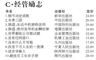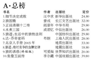 看看本周的榜單,帶給讀者的再次是了無新意的失望。我們惟一可以安慰的,是兩本同時上榜的《狼道》,既不是來自以《狼圖騰》占領(lǐng)傳統(tǒng)市場的長江文藝出版社,也不是以《狼的誘惑》吸引年輕讀者的世界知識出版社。對2004年來說,“狼”或許真的已經(jīng)成了圖騰,但是負責(zé)任的出版人不會永遠跟著圖騰走?梢钥隙ǖ氖,圖騰不可能永遠有效。