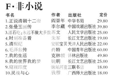 隨著12月的到來,對于出版界來說,2004年實際上已經(jīng)結(jié)束了。在2004年的最后一個月里,不大可能出現(xiàn)多少有分量的圖書了,大家都在為新的一年積蓄力量。于是在我們的榜單上,依然是那些夏季以來一直暢銷著的圖書成為主角。