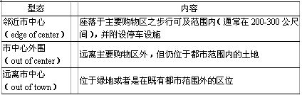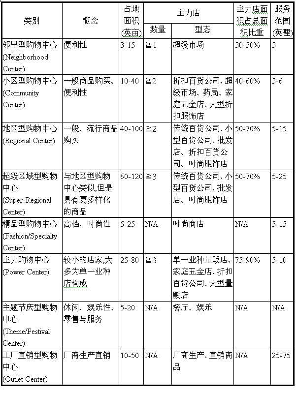 依國(guó)際購(gòu)物中心協(xié)會(huì)(International Council Shopping Centers, ICSC)依其規(guī)模與座落點(diǎn)將購(gòu)物中心分為以下六個(gè)類(lèi)型:鄰里型購(gòu)物中心(neighborhood center)、小區(qū)型購(gòu)物中心(community center)、超級(jí)區(qū)域型購(gòu)物中心(super regional center)、流行與特殊型購(gòu)物中心(fashion/specialty center)、主力購(gòu)物中心(power center)、主題節(jié)慶型購(gòu)物中心(theme / festival center)、通路型購(gòu)物中心(outlet center)。