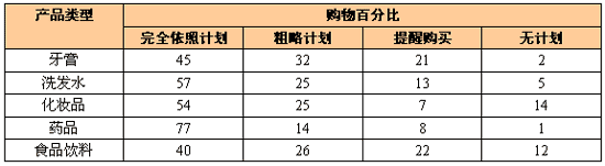 下面是根據(jù)英國零售學(xué)者Mc Goldrick的一個調(diào)查統(tǒng)計:由圖表可以發(fā)現(xiàn)藥品的計劃性購買較強,而食品和化妝品的無計劃購買相對較多。