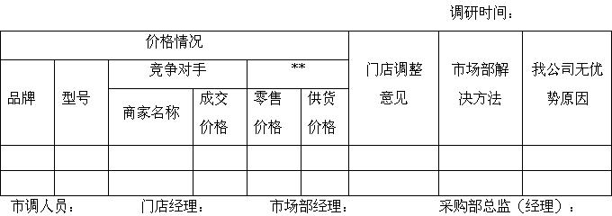 門店市調(diào)報(bào)告于當(dāng)天下午14:00前報(bào)至分公司市場(chǎng)部,分公司市場(chǎng)部會(huì)同采購部相關(guān)人員對(duì)市調(diào)出現(xiàn)的問題進(jìn)行研究,注明解決意見,由市場(chǎng)部經(jīng)理和采購部總監(jiān)(經(jīng)理)簽字后,于當(dāng)日18:00前回傳門店。