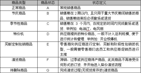 第三,根據(jù)家電零售企業(yè)的特性,對單品實行商品狀態(tài)管理也是進行科學(xué)的單品數(shù)量控制的方法。以一般的家電零售企業(yè)為例,商品可分為:正常商品、季節(jié)性商品、特價機、包銷定制買斷商品、清貨商品五種狀態(tài)。實施商品狀態(tài)管理可有效地解決。