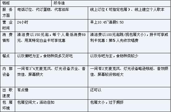 以上面的情形來說,在營業(yè)時間、餐點、內(nèi)部設備和包廂環(huán)境來講,是錢柜比較優(yōu)勢,雖然好樂迪的廣告打得兇而且全省的分店開得又比錢柜多,但以上列的表格來看,卻是略遜一籌。