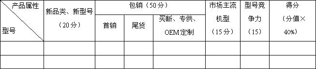 。3)包銷:指經(jīng)過銷售系統(tǒng)充分調(diào)研,采購系統(tǒng)談判簽約,利潤豐厚,市場規(guī)模較大,符合某電器的銷售能力,在全國或某電器某一區(qū)域范圍內(nèi)只供某電器單獨銷售,性價比明顯優(yōu)于市場其他商家所經(jīng)營型號的產(chǎn)品。