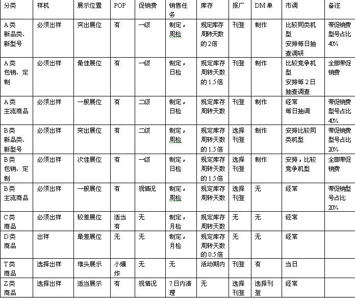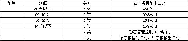 某電器全公司以分部為單位,按彩電、冰洗、空調(diào)、手機、IT、白小、影音等七個部類,將所經(jīng)營商品的所有型號依據(jù)商品屬性、利潤狀況、品牌知名度及市場占有率三個方面的不同評價標(biāo)準(zhǔn)打分(各部類內(nèi)不同類別,如IT部的數(shù)碼相機、光學(xué)相機、數(shù)碼攝槍、模擬數(shù)字?jǐn)z槍只在同類商品內(nèi)相比)。并按分值大小分為A類型號、B類型號、C類型號、D類型號等類別(特價機T、滯銷機Z單獨管理),針對不同類別采取相應(yīng)的營銷管理手段和管理辦法。