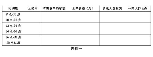 為此,我們在進行市場調(diào)查時,切不可讓慣性思維誤導(dǎo)我們。為了更加準確地分析該地網(wǎng)吧市場的前景,對于每一家網(wǎng)吧,都可以按照表格一,從周一至周日都要進行全面的調(diào)查,調(diào)查時間至少要維持在半個月以上。將從多家網(wǎng)吧收集的多張表格匯總,進行數(shù)據(jù)分析,作為投資新網(wǎng)吧的重要參考數(shù)據(jù)。