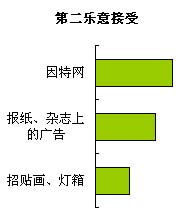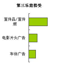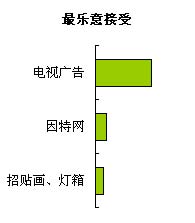 消費(fèi)者最樂意接受的認(rèn)知渠道是電視廣告,其次為因特網(wǎng),再次為宣傳品/宣傳冊,報(bào)紙、雜志上的廣告、招貼畫、燈箱、電影片頭廣告以及車體廣告也是其所認(rèn)可的一種主要的渠道。