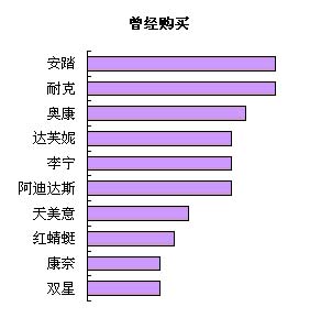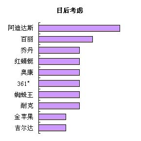 而在日后考慮的鞋類產(chǎn)品中,阿迪達(dá)斯排在了首位,新增添的品牌百麗的位置也非常靠前。其它新增添的品牌有喬丹,361°,蜘蛛王,金蘋果和吉爾達(dá)。