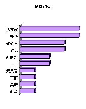 在消費(fèi)者最經(jīng)常購買的鞋類品牌中,排名前十位的品牌如下左圖:其中達(dá)芙妮這個(gè)皮鞋品牌首次超越運(yùn)動(dòng)鞋品牌排在了第一的位置,安踏名列第二位,蜘蛛王這個(gè)品牌在溫州地區(qū)銷售比較好。
