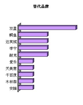 當(dāng)消費(fèi)者最經(jīng)常購買的鞋類產(chǎn)品一時(shí)無法買到,他們所選擇替代的產(chǎn)品中,國產(chǎn)品牌雙星占據(jù)了絕對大的份額。鱷魚,達(dá)芙妮,李寧,耐克的排名也比較靠前?梢钥闯,在溫州,國產(chǎn)鞋類產(chǎn)品是非常受歡迎的,但是消費(fèi)者對于原品牌的忠誠度不是很高。