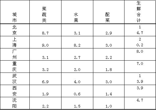 中國(guó)超市從90年代中期開(kāi)始涉及生鮮經(jīng)營(yíng),進(jìn)入21世紀(jì)以后,受到外資超市的促動(dòng),生鮮經(jīng)營(yíng)份額開(kāi)始增加。2000年北京市居民在超市購(gòu)買生鮮的比率占生鮮消費(fèi)總量的15%左右,零售業(yè)最發(fā)達(dá)的上海已經(jīng)達(dá)到20%左右(表1參考)。