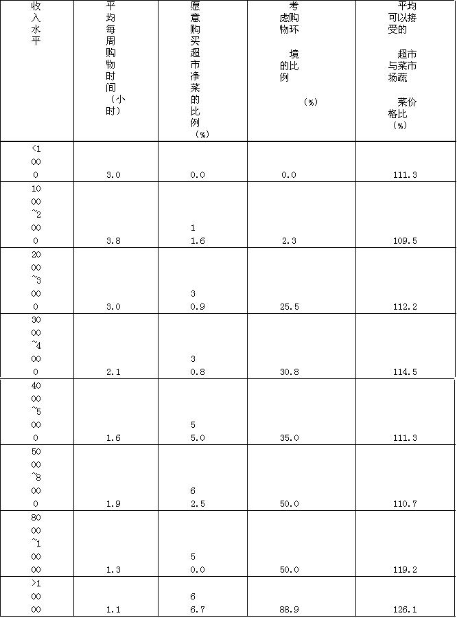市場(chǎng)競(jìng)爭(zhēng)除了質(zhì)量和價(jià)格外還有服務(wù)競(jìng)爭(zhēng)。收入越高,時(shí)間的價(jià)值越大,能節(jié)約顧客的購(gòu)物時(shí)間,也成為零售商業(yè)的重要賣點(diǎn)。節(jié)約購(gòu)物時(shí)間包括消費(fèi)者在超市購(gòu)買日用百貨的同時(shí)附帶購(gòu)買生鮮食品,以及超市生鮮食品經(jīng)過(guò)簡(jiǎn)單清洗和加工,能減少烹調(diào)時(shí)間。家庭月收入在1000元以下的消費(fèi)者通常去菜市場(chǎng)買“毛菜”,沒(méi)有人去過(guò)問(wèn)超市銷售的“凈菜”;家庭月收入達(dá)到5000元以上的消費(fèi)者中有50%以上愿意購(gòu)買凈菜;收入越高,消費(fèi)者去超市購(gòu)買凈菜的比例越高。同時(shí),不同收入消費(fèi)者對(duì)購(gòu)物環(huán)境的關(guān)注程度不同,消費(fèi)者收入越高,考慮購(gòu)物環(huán)境的比例越大。相比于農(nóng)貿(mào)市場(chǎng),超市以其優(yōu)雅、舒適的環(huán)境吸引著部分高收入消費(fèi)者的青睞(表2參考)。