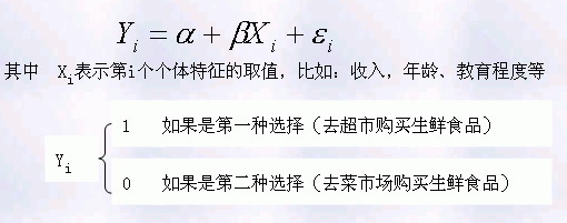 為了找出哪些主要因素影響消費(fèi)者選擇超市或農(nóng)貿(mào)市場(chǎng)購(gòu)買生鮮,我們采用了計(jì)量經(jīng)濟(jì)學(xué)中的分類選擇模型。在回歸模型中當(dāng)因變量只取兩個(gè)不同的值時(shí),就是一個(gè)二元選擇模型(Binary-choice model),假設(shè)每一個(gè)體都面臨二者挑一的選擇,并且其選擇依賴于可分辨的特征。如果對(duì)這種選擇運(yùn)用線性概率模型進(jìn)行研究,模型的回歸形式為: