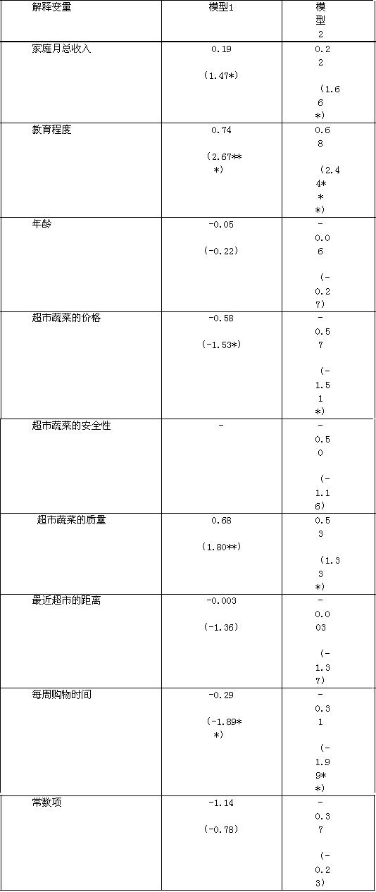 式中的收入水平指城市家庭人均月收入;生鮮食品的質(zhì)量和價(jià)格是消費(fèi)者對(duì)超市和菜市場(chǎng)生鮮食品的質(zhì)量和價(jià)格比較的虛擬變量;消費(fèi)者特征包括消費(fèi)者年齡、性別、教育程度以及食品安全意識(shí)等;市場(chǎng)發(fā)育程度指距離消費(fèi)者最近超市的距離;購(gòu)物時(shí)間是指消費(fèi)者平均每周的購(gòu)物時(shí)間。樣本數(shù)為200個(gè)顧客,他們分別在北京市小白羊超市的20多個(gè)門店中隨機(jī)調(diào)查中獲得的。
