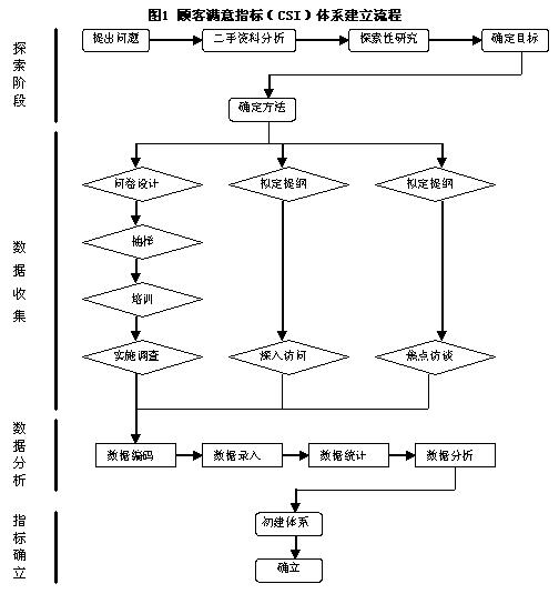 在建立顧客滿意指標(biāo)(CSI)體系時,首先要對該行業(yè)有一個大致的了解,只有在對行業(yè)背景有大致理解后,項目執(zhí)行人員才能明確需要進(jìn)一步深入的問題。由于構(gòu)建顧客滿意指標(biāo)體系基本上是一個基于顧客調(diào)查的過程,故對調(diào)查方法的選擇將直接影響最終結(jié)果的客觀性與科學(xué)性。除了二手資料收集外,圖1展示了三種常用的數(shù)據(jù)收集方法:抽樣問卷調(diào)查、深度訪談和焦點訪談。在獲得所需要的數(shù)據(jù)后,需要對收集的數(shù)據(jù)進(jìn)行歸類整理、統(tǒng)計分析,從而找出研究對象和被研究對象的相關(guān)性。