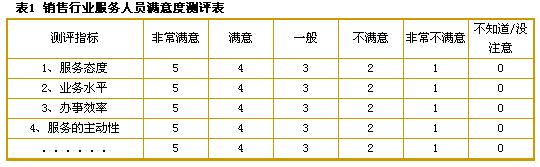 量表的設(shè)計包括兩步。第一步是“賦值”,根據(jù)設(shè)定的規(guī)則,對不同的態(tài)度特性賦予不同的數(shù)值。第二步是“定位”,將這些數(shù)字排列或組成一個序列,根據(jù)受訪者的不同態(tài)度,將其在這一序列上進(jìn)行定位。之所以將測量指標(biāo)量化(數(shù)字化),一是因為數(shù)字便于統(tǒng)計分析,二是數(shù)字使態(tài)度測量活動本身變得容易。表1為針對銷售行業(yè)的服務(wù)人員的滿意度測評表。