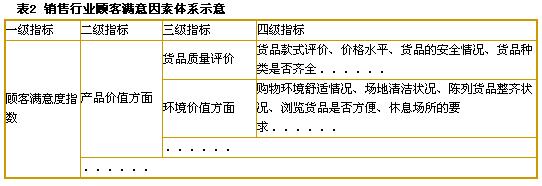 建立起來的行業(yè)顧客滿意因素體系包含了幾乎所有可能影響顧客滿意指數(shù)的指標(biāo),多數(shù)都以三級或四級指標(biāo)的形式表現(xiàn)出來,表2為銷售行業(yè)的顧客滿意因素體系。