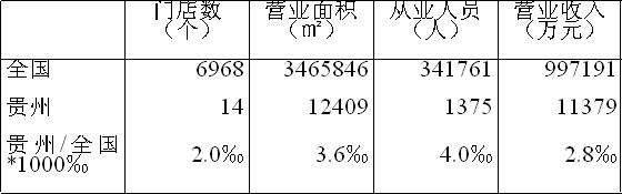 。ㄒ唬⿺(shù)量少。2004年,貴州擁有本土限額以上連鎖餐飲企業(yè)集團(tuán)兩家,而全國(guó)共有限額以上餐飲業(yè)集團(tuán)251家,貴州不到全國(guó)的1%。西部其他省市中,重慶有10家,云南7家,陜西6家,四川和新疆各5家,甘肅4家,內(nèi)蒙3家,青海2家。貴州與青海并列西部第8位。