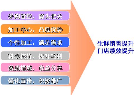 “新鮮、健康、安全、放心”是聯(lián)華標(biāo)超生鮮轉(zhuǎn)型的重點(diǎn)訴求,在細(xì)分目標(biāo)市場(chǎng)的同時(shí)我們還十分注重經(jīng)營(yíng)品質(zhì)和商品檔次的提升,通過(guò)這一提升將聯(lián)華標(biāo)超生鮮經(jīng)營(yíng)與農(nóng)貿(mào)市場(chǎng)的生鮮經(jīng)營(yíng)進(jìn)行了分割,同時(shí)也避免了標(biāo)超門店無(wú)謂的價(jià)格競(jìng)爭(zhēng)。精細(xì)化、人性化的現(xiàn)場(chǎng)加工是聯(lián)華轉(zhuǎn)型成功的又一特色,這也是培育門店核心競(jìng)爭(zhēng)力的關(guān)鍵。如今,喜歡新鮮時(shí)尚的上海消費(fèi)者在家門口就能買到高品質(zhì)進(jìn)口牛肉、三文魚、章魚籽,以及盒裝凈菜、加工后的生魚片等個(gè)性化生鮮商品。