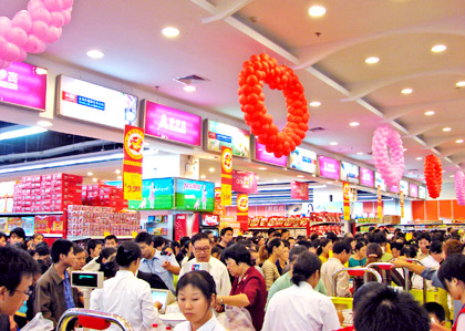 早在開(kāi)業(yè)幾天前,消費(fèi)者的購(gòu)物激情就被步步高的開(kāi)業(yè)廣告點(diǎn)燃。因此天還沒(méi)有亮的時(shí)候,數(shù)萬(wàn)消費(fèi)者早已聚集在步步高懷化店前坪,等候傳說(shuō)已久的“價(jià)格盆底核彈”的引爆!早晨7點(diǎn)左右,因?yàn)榫奂娜肆魈,門(mén)店不得不提前營(yíng)業(yè)以緩解人流壓力。隨著大門(mén)的打開(kāi),消費(fèi)者的激情也終于找到了宣泄的出口:十分鐘內(nèi),一到四樓總面積三萬(wàn)五千平米的店堂全部被人潮塞滿(mǎn),在人流高峰時(shí)段,顧客甚至連大門(mén)都擠不進(jìn)!