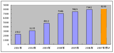 2003年以來,在空調(diào)出口增長的帶動下,國內(nèi)空調(diào)產(chǎn)品產(chǎn)量實現(xiàn)突破式增長,連續(xù)三年保持在7000萬臺以上,預(yù)計2007年國內(nèi)空調(diào)產(chǎn)量突破8000萬臺。國內(nèi)市場銷量2600萬臺左右。