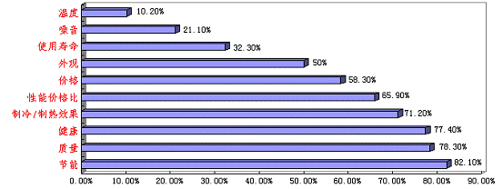 國務(wù)院發(fā)展研究中心市場經(jīng)濟(jì)研究所家電課題組《2005-2007中國城市居民家庭空調(diào)產(chǎn)品需求狀況調(diào)研報告》數(shù)據(jù)顯示:節(jié)能、質(zhì)量、健康分別成為消費者最關(guān)心的產(chǎn)品要素,分別達(dá)到82.1%、78.3%、77.4%。