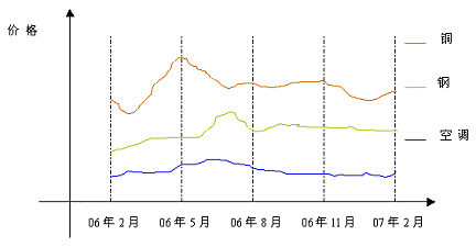 圖四:2006.2月-2007.2月銅、鋼、空調(diào)同期價格走勢