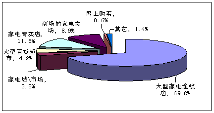 《2005-2007中國城市居民家庭空調(diào)產(chǎn)品需求狀況調(diào)研報告》數(shù)據(jù)顯示,在對消費者購買空調(diào)產(chǎn)品的渠道選擇中,城市消費者預(yù)期購買空調(diào)的渠道集中化趨勢已經(jīng)很明顯,69.8%的消費者會選擇在專業(yè)連鎖家電賣場購買空調(diào),在一、二級城市市場,選擇在連鎖家電賣場購買的比重更是高達(dá)86.2%。