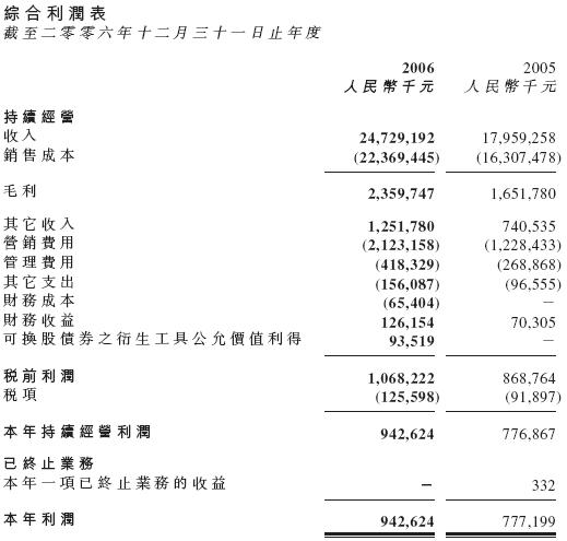 6、2006年,本集團(tuán)的其他收入較2005年的7.41億元增加至12.52億元。上升主要由于本集團(tuán)規(guī)模擴(kuò)大后,來自供貨商的收入增加,由2005年的4.93億元(約占收入2.74%)增加至2006年的約人民幣9.29億元(占收入約3.76%)