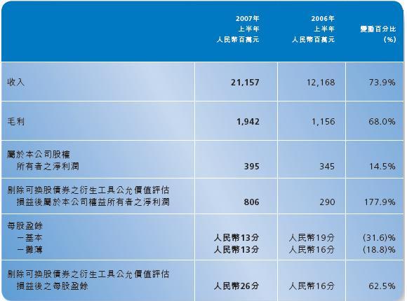 2007年首6個(gè)月,本集團(tuán)實(shí)現(xiàn)總收入為人民幣21,157百萬(wàn)元,比上年同期增長(zhǎng)73.9%,本公司權(quán)益所有者應(yīng)占利潤(rùn)為人民幣395百萬(wàn)元,比上年同期增長(zhǎng)14.5%(其中由于可換股債券之衍生工具公允價(jià)值評(píng)估導(dǎo)致本期賬面利潤(rùn)減少人民幣411百萬(wàn)元,而上年同期則為增加賬面利潤(rùn)人民幣54百萬(wàn)元)。期內(nèi),本集團(tuán)新進(jìn)入城市8個(gè),新增門(mén)店67家;截至2007年6月30日,本集團(tuán)零售網(wǎng)絡(luò)覆蓋全國(guó)168個(gè)城市,共有門(mén)店654家,其中新開(kāi)旗艦店5家,已改造完成的旗艦店33家;總營(yíng)業(yè)面積為2.45百萬(wàn)平方米,比上年末增長(zhǎng)10.5%。