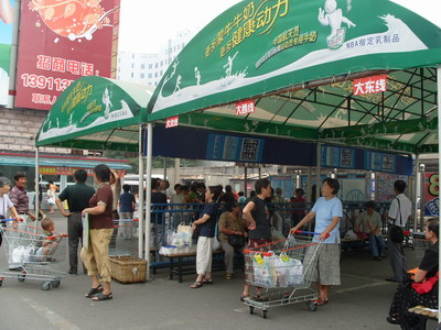 如果先天不足也不要氣餒,北太平莊店在北京最先啟動了免費班車,目前這家超市的小車站有班車14輛,七條線路,輻射到整個商圈。北太平莊店右側是可以容納100輛車的停車場。我們可以看到停車場墻上的大型標語“購物50元以上,免收90分鐘停車費。”