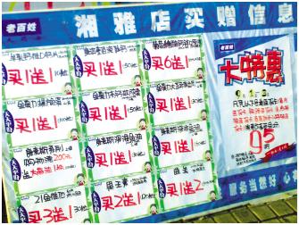 在藥店櫥窗廣告宣傳上,絕大多數(shù)藥店都體現(xiàn)為張貼產(chǎn)品的宣傳畫,并收取企業(yè)的宣傳費用,這是藥店重要的營業(yè)外收入之一。目前許多藥店存在的問題是,在取舍櫥窗廣告的時候,重視廠家費用的多少,而輕視了其給門店整體效果帶來的負面影響(圖3)。如有的櫥窗廣告影響了店內的采光;有的嚴重損害了藥店的品牌形象,顯得藥店雜亂無章。藥店櫥窗廣告應注重協(xié)調和美感,透過櫥窗廣告的布局、環(huán)境、氛圍來體現(xiàn)藥店的和諧美。