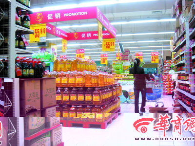 昨日上午10時(shí)30分左右,在家樂福小寨店,記者看到,除了小食品等小部分商品區(qū),該店內(nèi)多處懸掛著“促銷”的條幅,上面有各種商品的價(jià)格,其中包括5升桶裝食用油以及豬肉等商品。