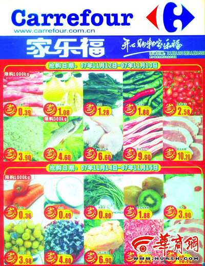 家樂福小寨店的宣傳海報(bào)顯示,11月12日到13日,“搶購”商品有帶皮五花肉、帶皮前腿、草魚和尖椒等,其中帶皮五花肉每斤9.6元,帶皮前腿每斤10.20元。而擬在11月14日到15日“搶購”的商品中帶皮后腿每斤10.8元、魚排每斤3.9元。宣傳海報(bào)上還特別標(biāo)明有“限購”數(shù)量。
