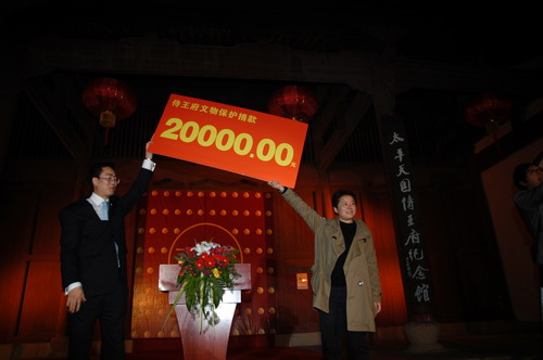 當晚,眾多國際一線大牌JUST CAVALI、IT.plus、JOOP!、蘭蔻、Swarovski等與銀泰百貨有著良好合作的大牌紛紛為慈善拍賣提供了友情贊助,加上現(xiàn)場知名主持華少的煽情表演,更是激發(fā)了各界人士,銀泰百貨供應(yīng)商代表乃至VIP金卡顧客的參與熱情,競相為文物保護事業(yè)解囊相助,競拍價此起彼伏,現(xiàn)場不斷出現(xiàn)新的高潮,使得整臺慈善時尚酒會精彩紛呈。拍賣結(jié)束后,銀泰百貨金華公司總經(jīng)理王劍強將拍賣所得的兩萬余元慈善資金全部捐獻給金華市文化局用于侍王府的文物保護工作。而之后進行的走秀環(huán)節(jié),國際一線大牌傾情領(lǐng)秀婺城T臺,更是將整場酒會氣氛推向了最高潮。
