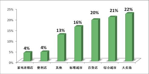 參與本次調(diào)查的門店店長主要來自大賣場、綜合超市、百貨店、標(biāo)準(zhǔn)型超市這4大業(yè)態(tài)(占比79%),來自家電連鎖店和便利店兩大業(yè)態(tài)的店長各占4%,另有13%的調(diào)查參與者來自其他業(yè)態(tài)。