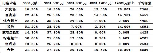 從調(diào)查數(shù)據(jù)來看,各大業(yè)態(tài)中月薪水平較高的是大賣場和百貨店這兩大業(yè)態(tài),平均月薪分別為7566元和6459元,均高于所有參與調(diào)查者的平均水平;月薪水平最低是便利店業(yè)態(tài),平均月薪僅為2534元。其他業(yè)態(tài)的月薪水平差異不大。
