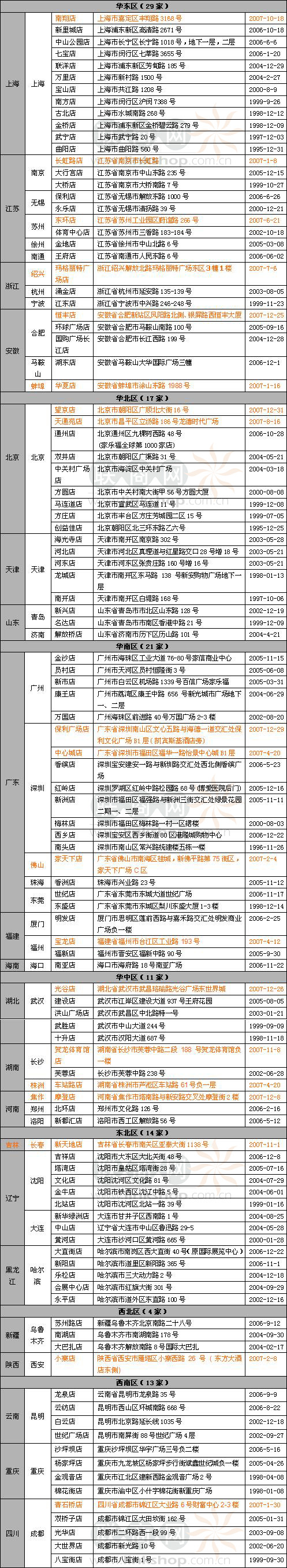 (注:其中橘紅色字體部分為2007年新開門店)