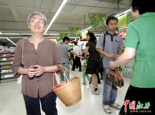 (6月1日是國家“限塑令”正式生效的日子。上午9點,記者在南昌各大超市看到,許多市民紛紛帶著自己籃子去超市購物。圖為吳大媽正提著竹籃子去超市購物。)