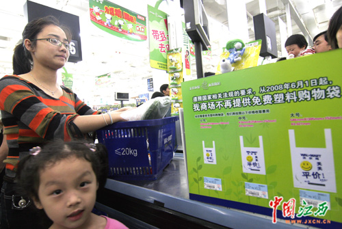 南昌沃爾瑪超市常務副總馬經理告訴記者,為了配合國家6月1日起實行“限塑令”,超市一個月之前就向顧客進行了有關宣傳和問卷調查。另外,超市為了鼓勵顧客使用環(huán)保型塑料袋和布袋,只要顧客消費88元,就能免費獲得一個環(huán)保袋。