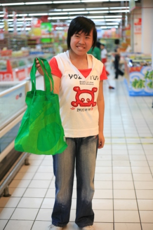 (女孩展示自帶的購物袋,笑得很燦爛)