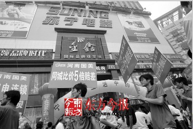 在本月4日,蘇寧電器對(duì)媒體宣布,6月21日友誼旗艦店正式開業(yè),之后,供應(yīng)商的厄運(yùn)就開始了。在那段“不節(jié)不慶”的日子里,國(guó)美電器與永樂電器諸家門店出現(xiàn)了近乎荒誕的促銷活動(dòng)。