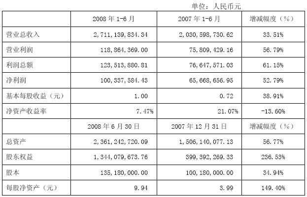 特別提示:本公告所載2008 年半年度財務數據僅為初步核算的結果,已經公司內部審計部門審計,但未經會計師事務所審計,與最終公布的半年度報告可能存在差異,請投資者注意投資風險。